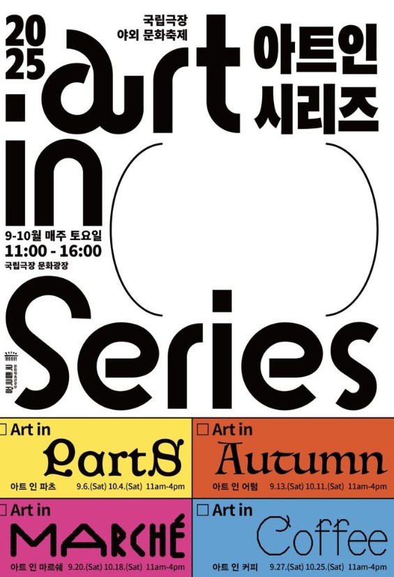 가을 주말, 남산 자락 국립극장이 예술과 장터로 살아난다. 국립극장은 오는 9월 6일부터 10월 25일까지 매주 토요일, 야외 문화축제 ‘아트 인 시리즈’를 연다. 창극, 국악, 인디음악, 수공예, 농산물, 커피까지 어우러지는 복합 문화 장터다.